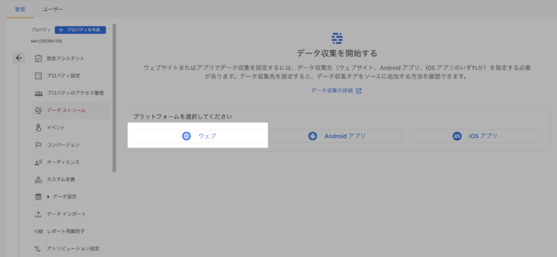 通常上記の流れからデータストリーム作成に進み、ウェブをクリックします。